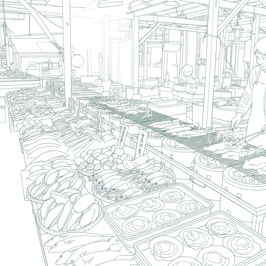 ホタテの浜焼きや焼き魚、豪快な漁師飯など、出来立てを贅沢にご堪能いただけるほか、マグロや金目鯛の解体ショーなどのイベントも不定期で開催され、市場は活気に満ち溢れています。